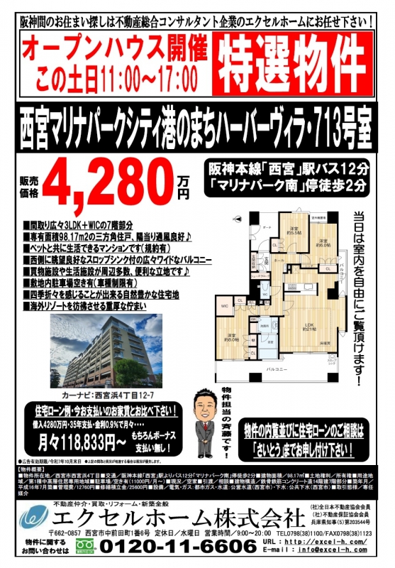 オープンハウス開催!「西宮マリナパークシティ・港のまちハーバーヴィラ」三方角住戸!陽当り通風眺望良好、是非ともご来場下さい♪